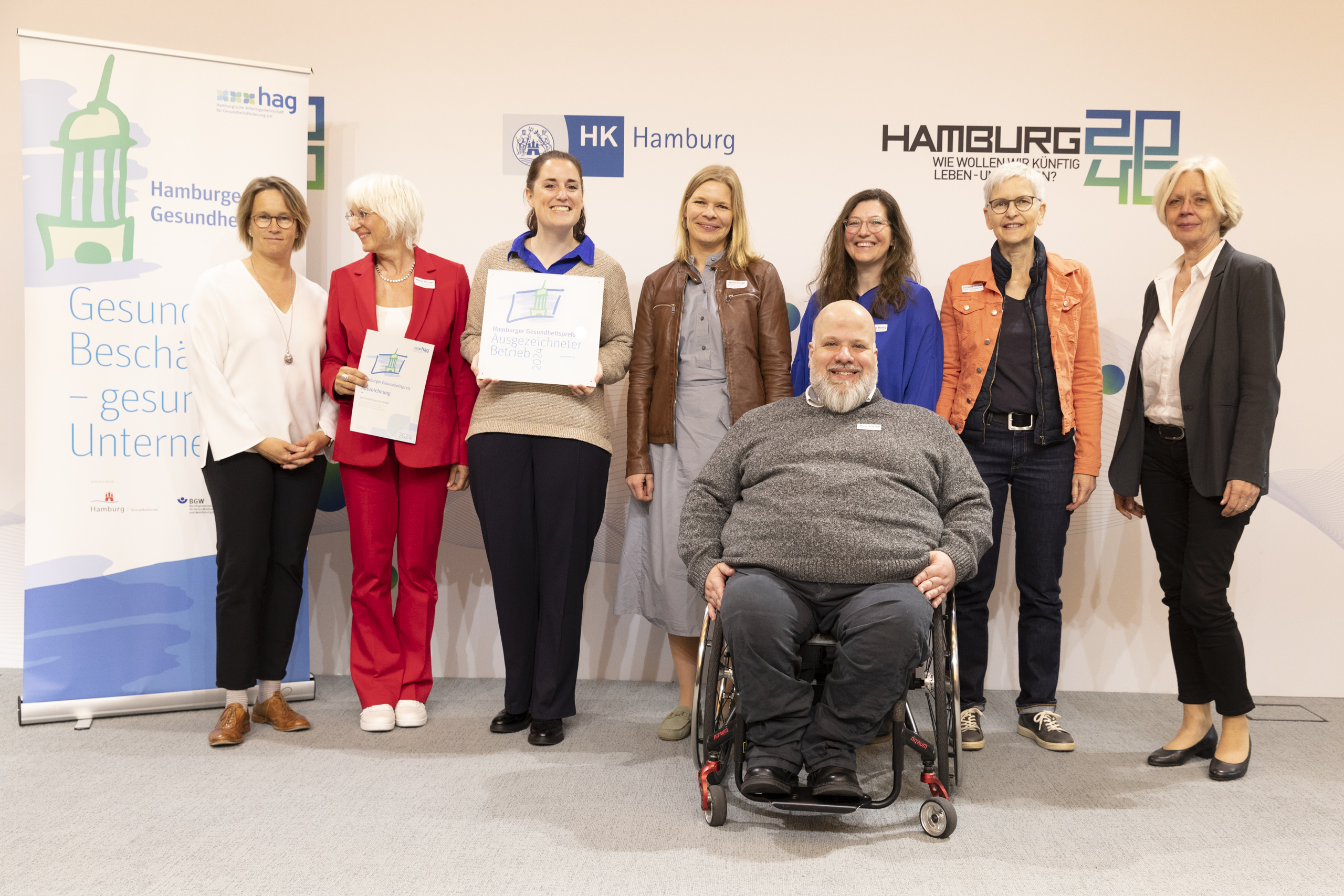 Die feierliche Preisverleihung fand am 6. Mai im Rahmen des 18. Gesundheitstags der Hamburger Wirtschaft in der Handelskammer Hamburg statt. Melanie Schlotzhauer, Senatorin für Arbeit, Gesundheit, Soziales, Familie und Integration und Schirmherrin des Preises, und die HAG-Vorsitzende Prof. Dr. Susanne Busch ehrten die Preisträger:innen, darunter die pme Familienservice GmbH (Standort Hamburg).