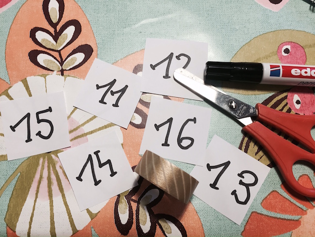 Alle Socken füllen und mit den Klammern an der Leiste oder der Kordel feststecken. Auf Papier mit Edding die Zahlen 1 - 24 malen, ausschneiden und mit dem Tape auf die Leiste pinnen. Hier und da eine Weihnachtskugel dranhängen.