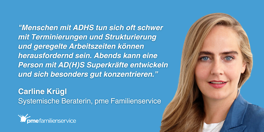 „Neurodivergente Menschen nehmen Informationen auf ganz eigene Weise wahr und verarbeiten sie unterschiedlich – das ist eine natürliche Vielfalt, die wir im Arbeitsalltag berücksichtigen sollten“, sagt Carline Krügl, systemische Beraterin beim pme Familienservice. Sie beschäftigt sich seit ihrem Studium intensiv mit ADHS/ADS und dem neurodivergenten Spektrum und begleitet Unternehmen und Betroffene im Arbeitsleben.