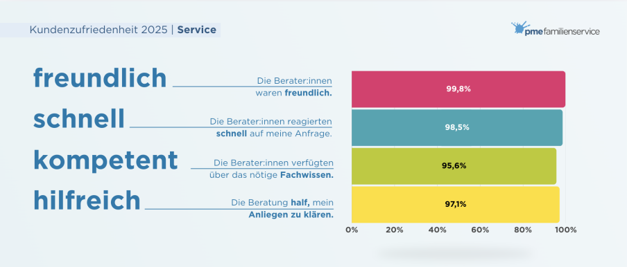 In herausfordernden Lebenssituationen brauchen Menschen schnelle, kompetente Hilfe – und jemanden, der wirklich zuhört und proaktiv unterstützen kann. Genau das schätzen unsere Kund:innen am pme Familienservice, wie die Kundenevaluation 2025 zeigt.